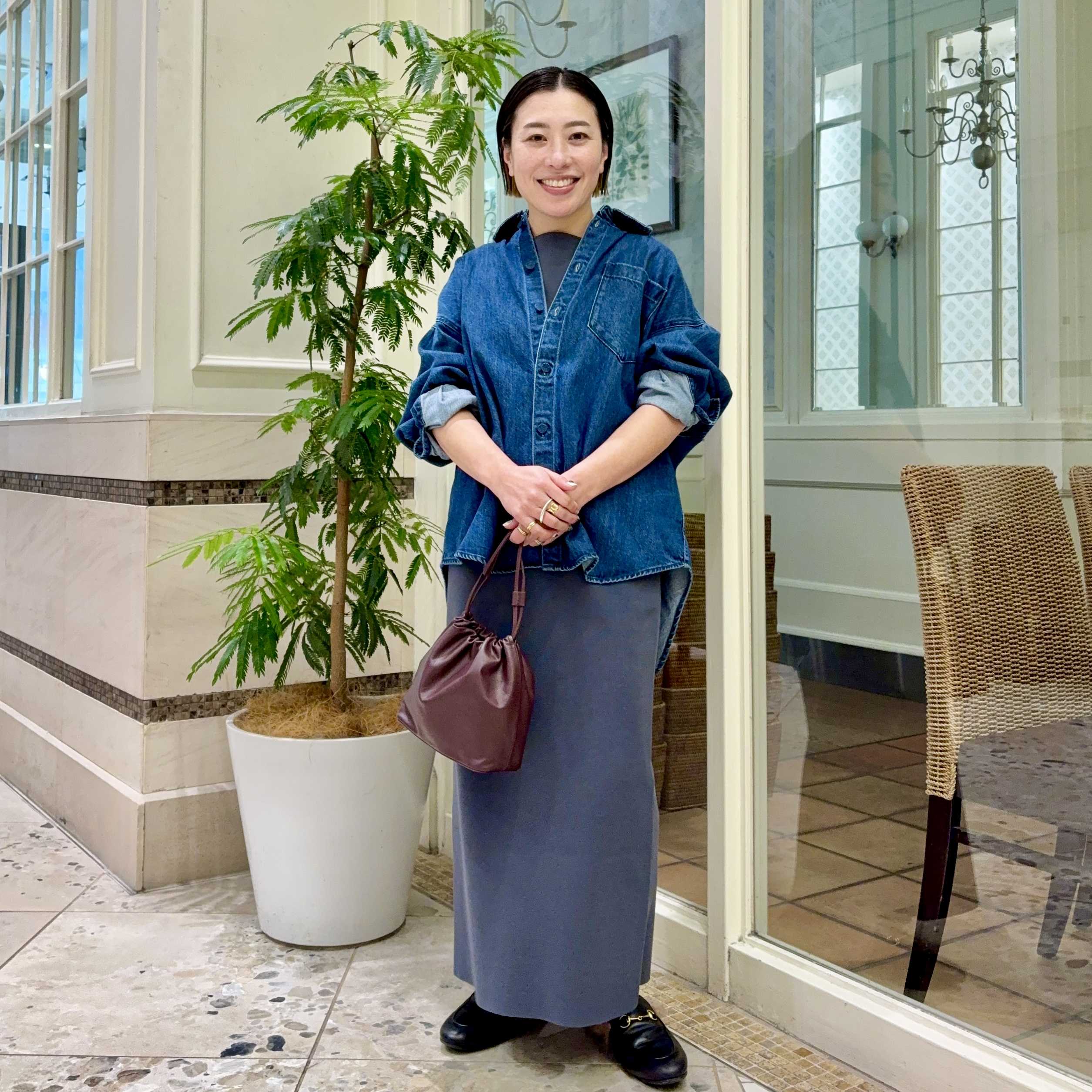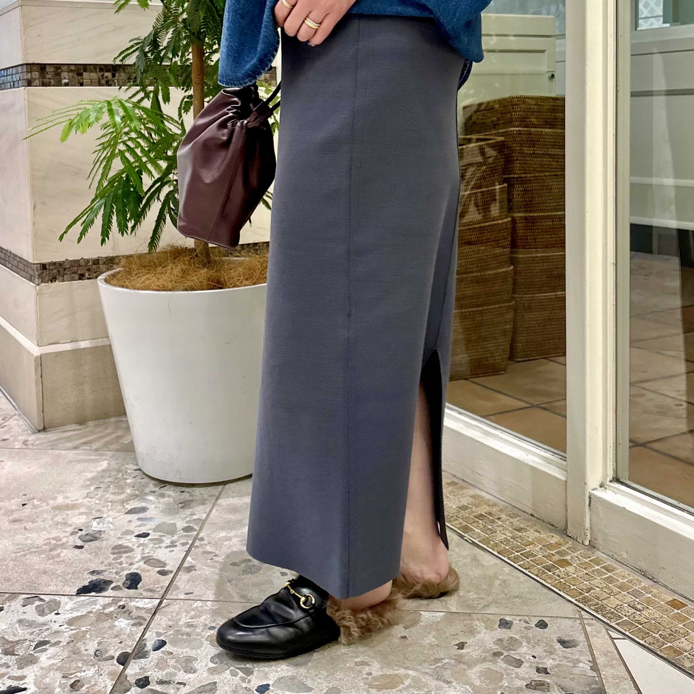 タイトスカートですが体のラインを拾いづらく、スッキリ見せてくれます。