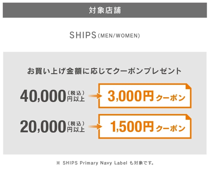 SHIPS Member’s Club会員の皆様へ、一定金額以上のお買い物で、その場で使える最大3,000円オフのお得なクーポンをプレゼントいたします。当日入会されたお客様も対象です。